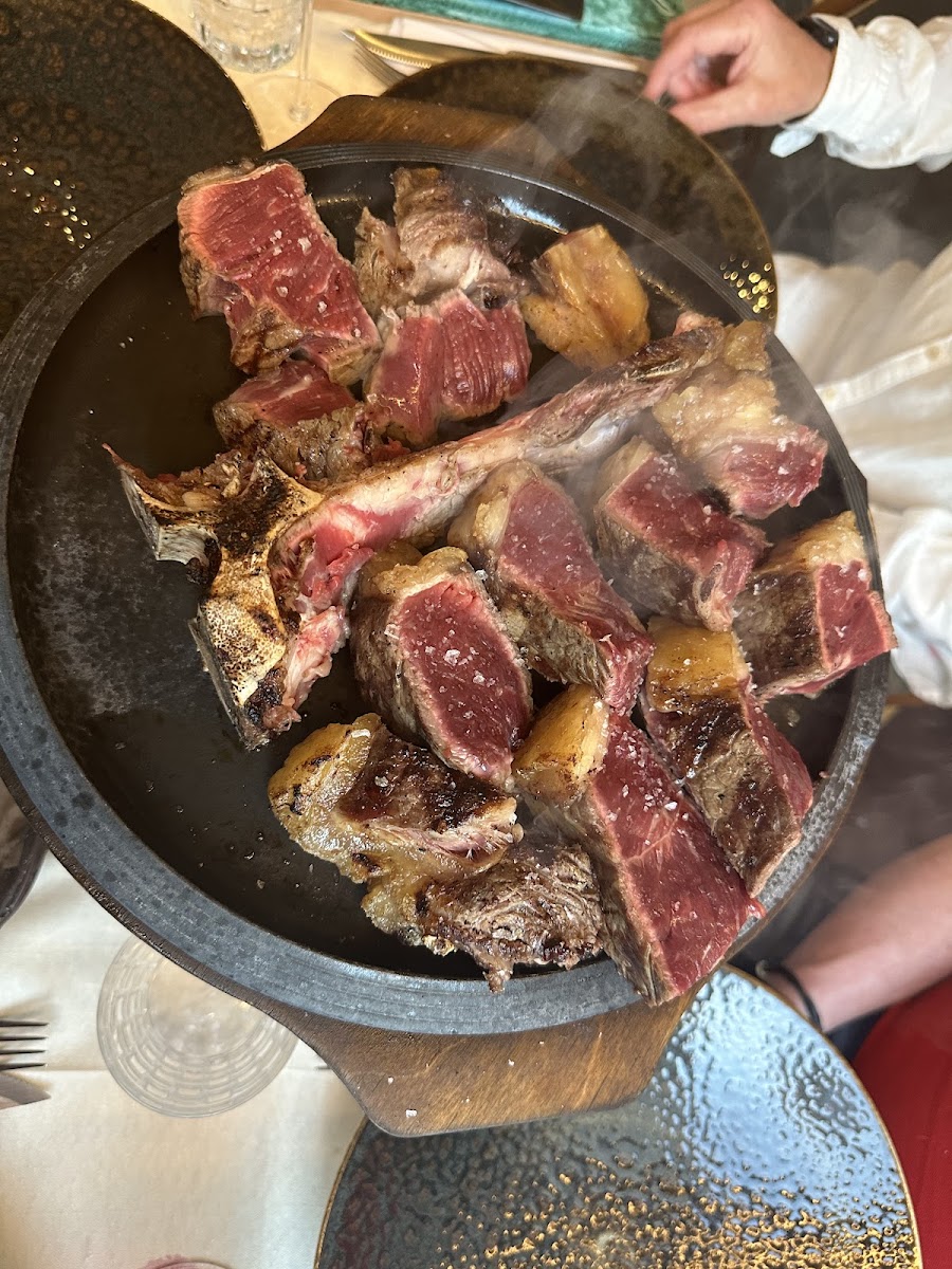 We experienced just a perfect dinner with amazing staff at this Restaurant. First of all welcoming of staff and their attitude thought the night was utterly professional and friendly. This was the key poind that made our dinner an unforgettable experience. We ordered a "bistecca a la fiorentina" which stand for T-bone steak. First of all mest was super juicy and soft and extra delicious. At first place they Cook it rare without asking you, but do not worry, they serve it on a Hot pot and you will still be able to Cook it as medium or well done on your table! We ordered french fries but then change our minds as baked potatoes. Later a plate of french fries came to the table, even before realised it our waiter took it and change with baked ones immediately. Was such a quick and professional attitude to correct the wistake. We did enjoy a bottles of White wine as per recommend action of our waiter and it was delicious (name can be found at pictures) highly aromatik delicious wine. Befor we leave, staff surprise us with a sweet looking biscuit plate and delicious digestives called "limoncello" Place is in the heart of downtown and so colorful. Meat was sooo delicious. And when these compined with professional and friendly service; then it is called perfection.